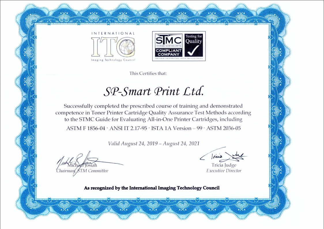 SP-SmartPrint certified international standard - STMC requires checking output, a quality control toner cartridges. Accreditation by the International Imaging Technology Council ITC-, an international organization international standard imaging technology http://www.i-itc.org/stmguide.htm